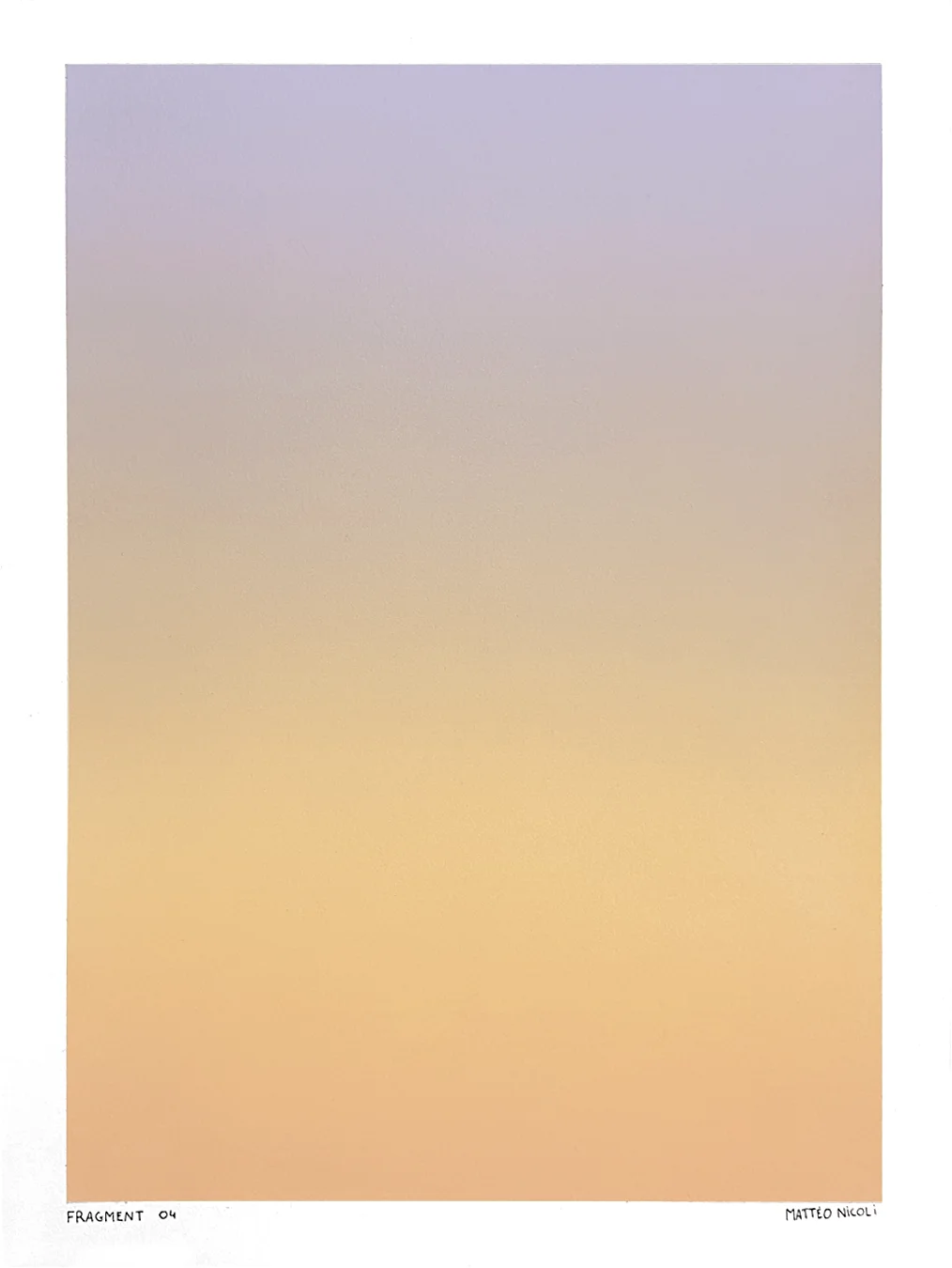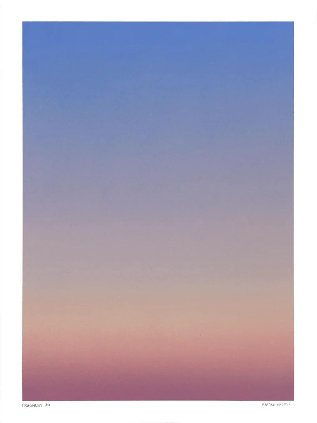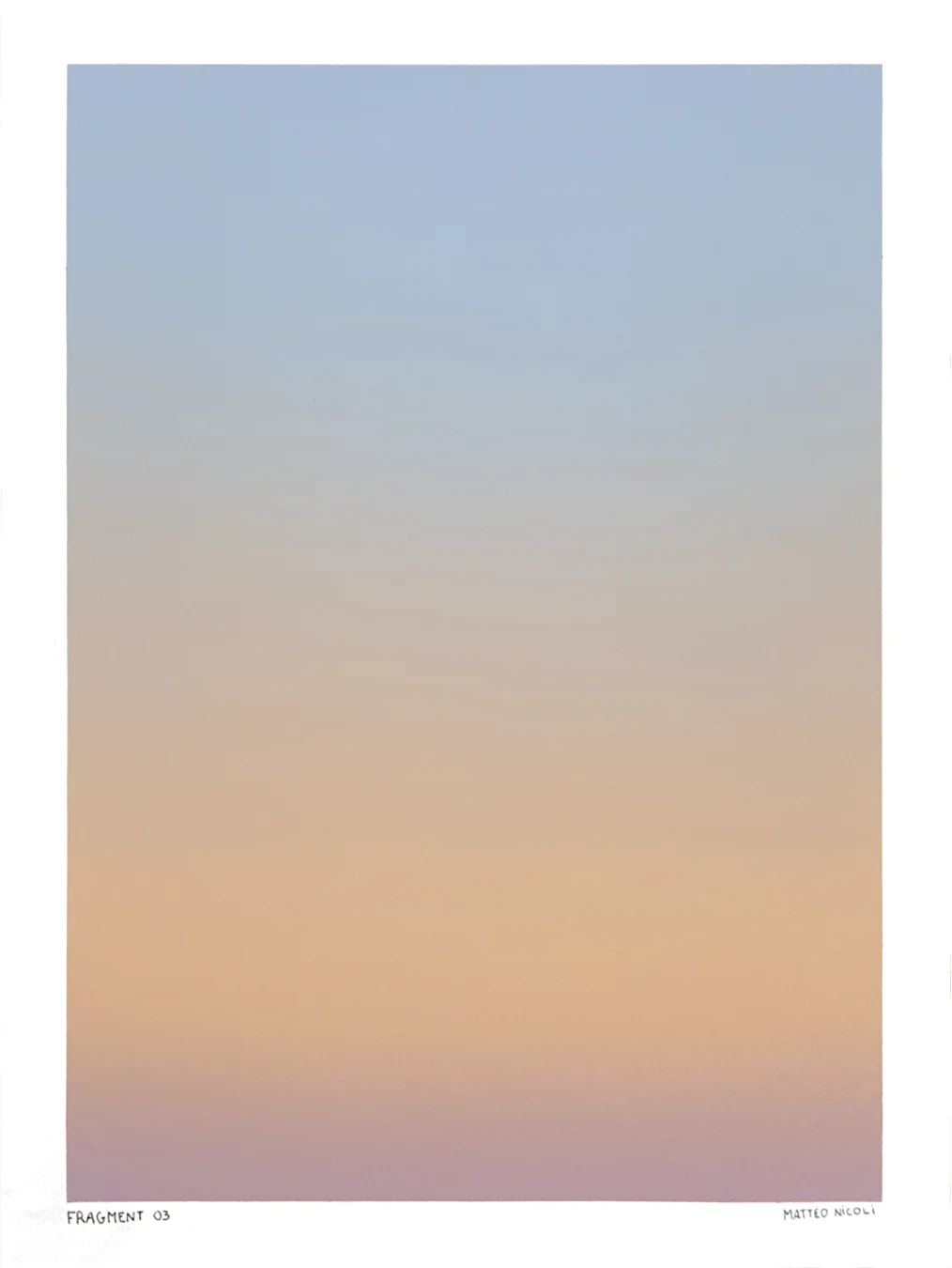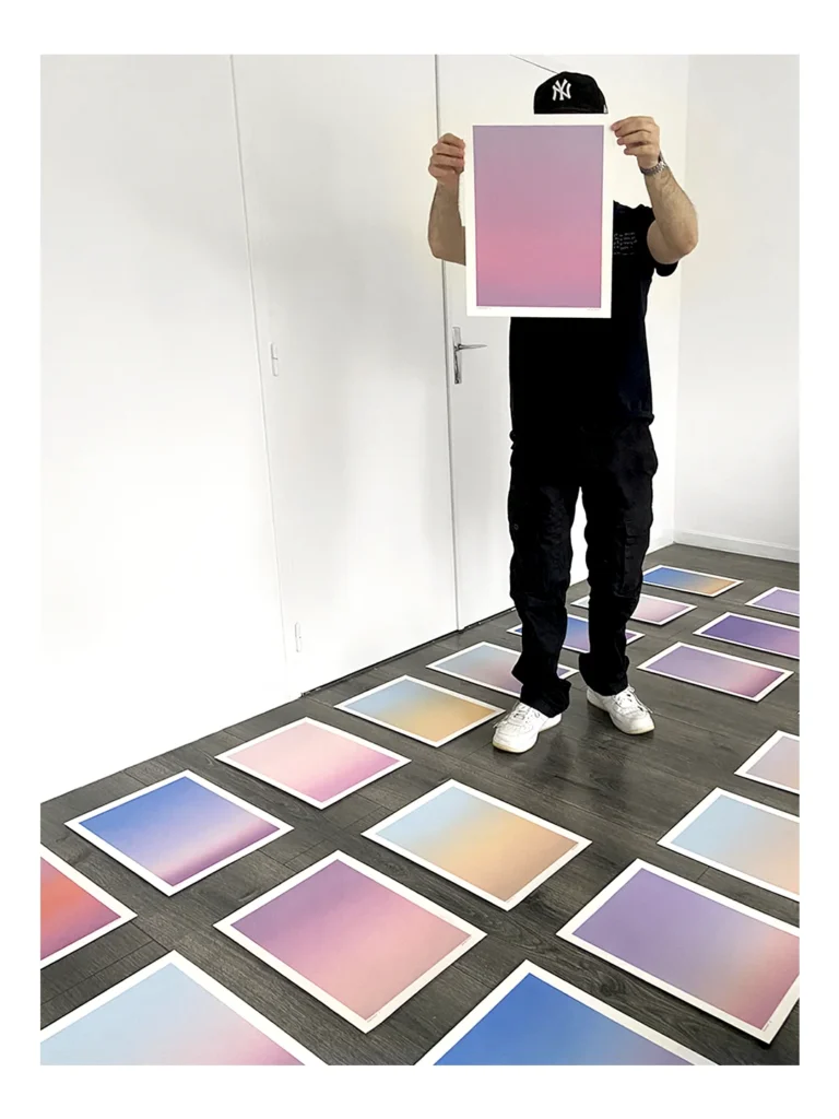 FRAGMENT est une série de 20 œuvres uniques explorant les variations de lumière du ciel aux moments de transition du jour. Chaque pièce capture un fragment du ciel, entre la nuit et le jour, à l’aube ou au crépuscule, lorsque les couleurs se transforment progressivement et que le ciel révèle de multiples nuances.