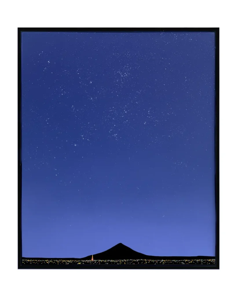 Fuji s’inscrit dans la collection Twilight, explorant l’immensité du ciel à la tombée de la nuit. Cette toile représente une vue sur Tokyo, dominée par le Mont Fuji, qui se dresse majestueusement à l’horizon. Le format portrait accentue la verticalité du ciel, soulignant son immensité par rapport aux éléments terrestres.