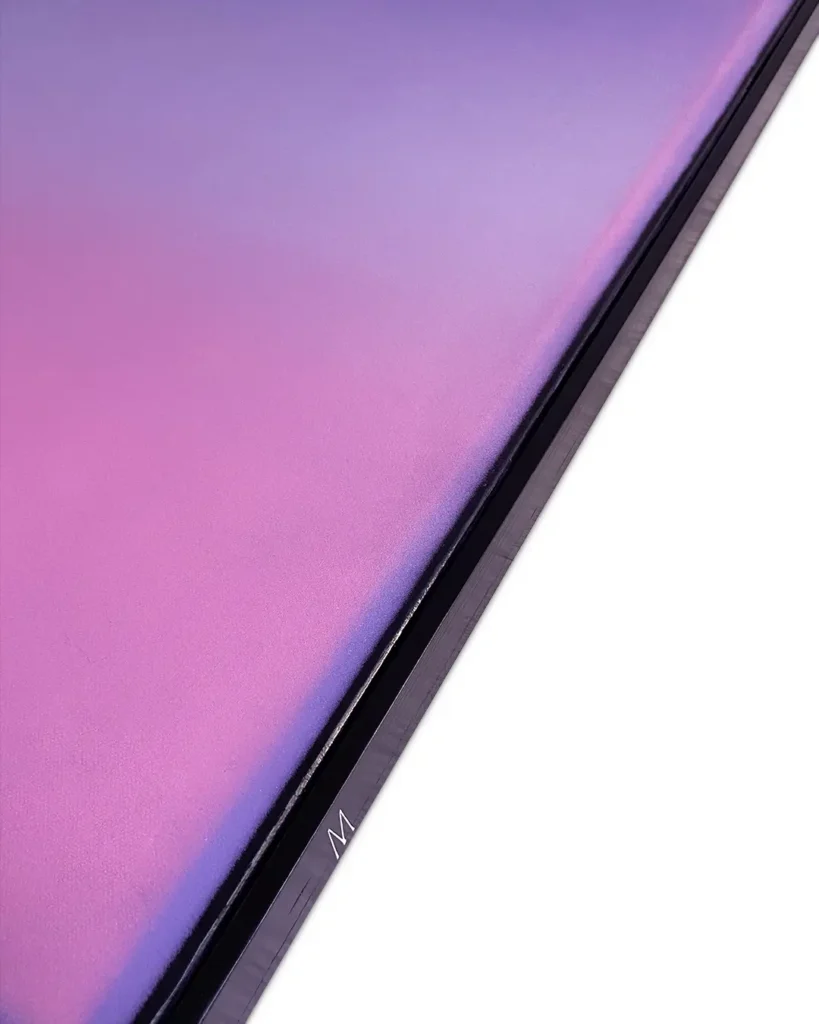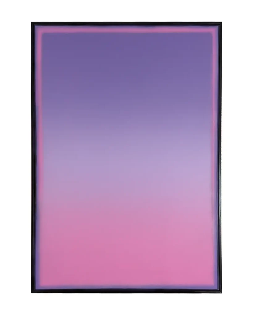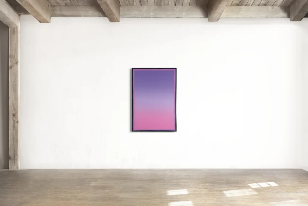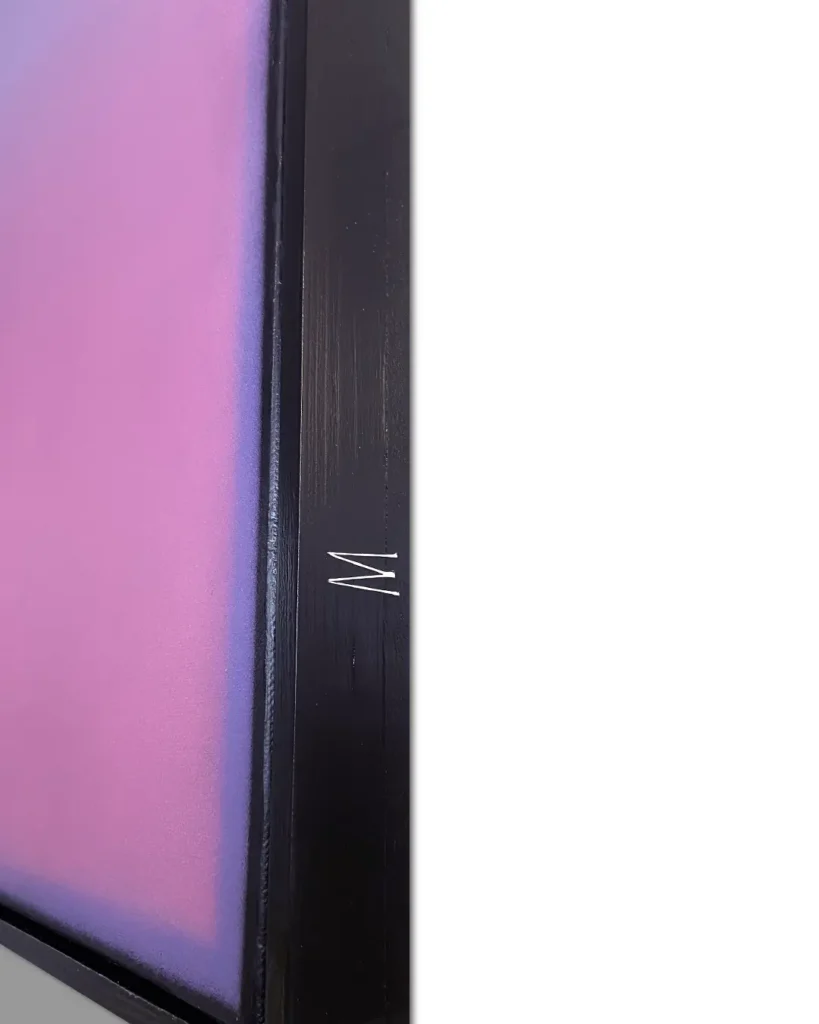 Le contour lumineux de la toile crée une transition délicate, renforçant l’idée de passage entre le jour et la nuit, tandis que le cadre noir suggère l’obscurité environnante. Ce contraste subtil attire l’attention sur le dégradé central, invitant le spectateur à plonger dans l’immensité du ciel crépusculaire.