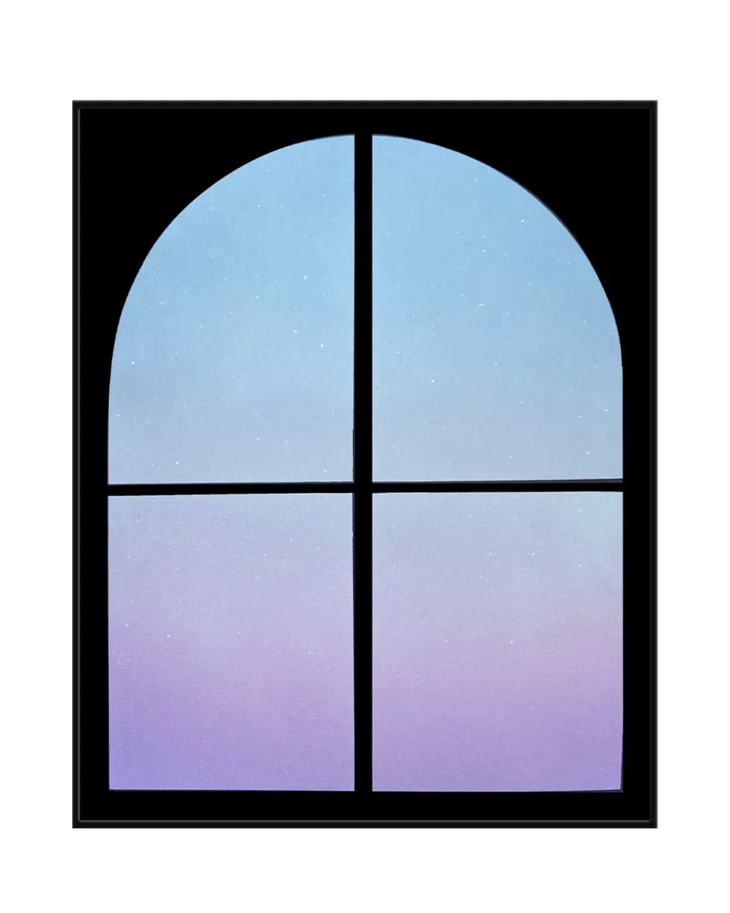 La fenêtre est ici représentée avec subtilité, uniquement par sa forme arquée et ses croisillons, permettant au regard de ne pas s’attarder sur le cadre mais de se laisser happer par l’immensité du ciel.Cette composition capture l’instant délicat de l’aube, lorsque la nuit s’efface pour laisser place à la lumière naissante. Le dégradé de couleurs, allant des teintes violettes sombres aux nuances de bleu clair, traduit cette transition douce. Les tons violets rappellent la nuit qui se retire, tandis que le bleu lumineux en haut de la toile évoque le ciel déjà éclairé de l’autre côté de l’horizon. De fines touches blanches suggèrent les étoiles qui s’estompent, renforçant cette impression de légèreté et d’immensité.